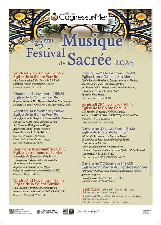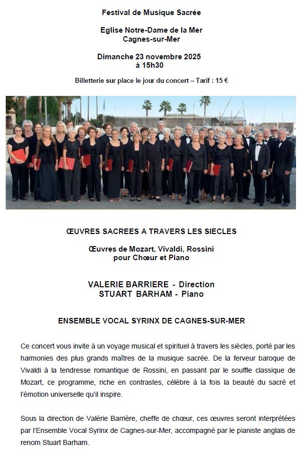 | Notre Dame de la Mer avenue du général Leclerc | Concert dans le cadre du Festival de Musique sacrée de Cagnes sur Mer Oeuvres de Vivaldi, Mozart, ... Piano : Stuart BARHAM Direction : Valérie BARRIERE Infos et Billetterie Flyer Nice Matin | ||